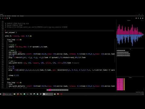 I love how you overlap and offset simple melodic, rhythmic and LFO patterns, creating kaleidoscopic textures, I’m a huge fan. Again, i would love to see how you live code these textures in real time, if you’re so inclined.