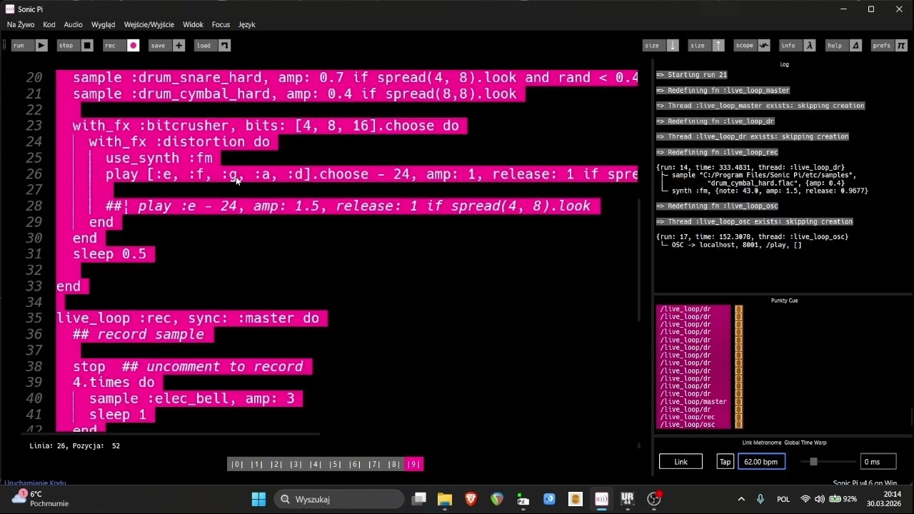 Hi, I played on guitar with my code. Guitar + Sonic pi + pd.