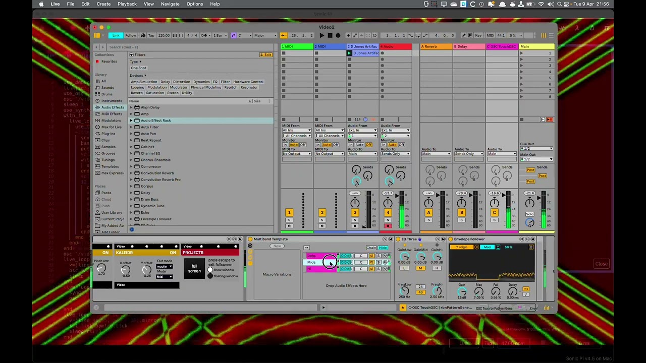 Been having fun getting to grips with Ableton 12 linking tyo Sonic PI. Found it was pretty cool to set up a visualiser in Live which can be driven by Sonic PI