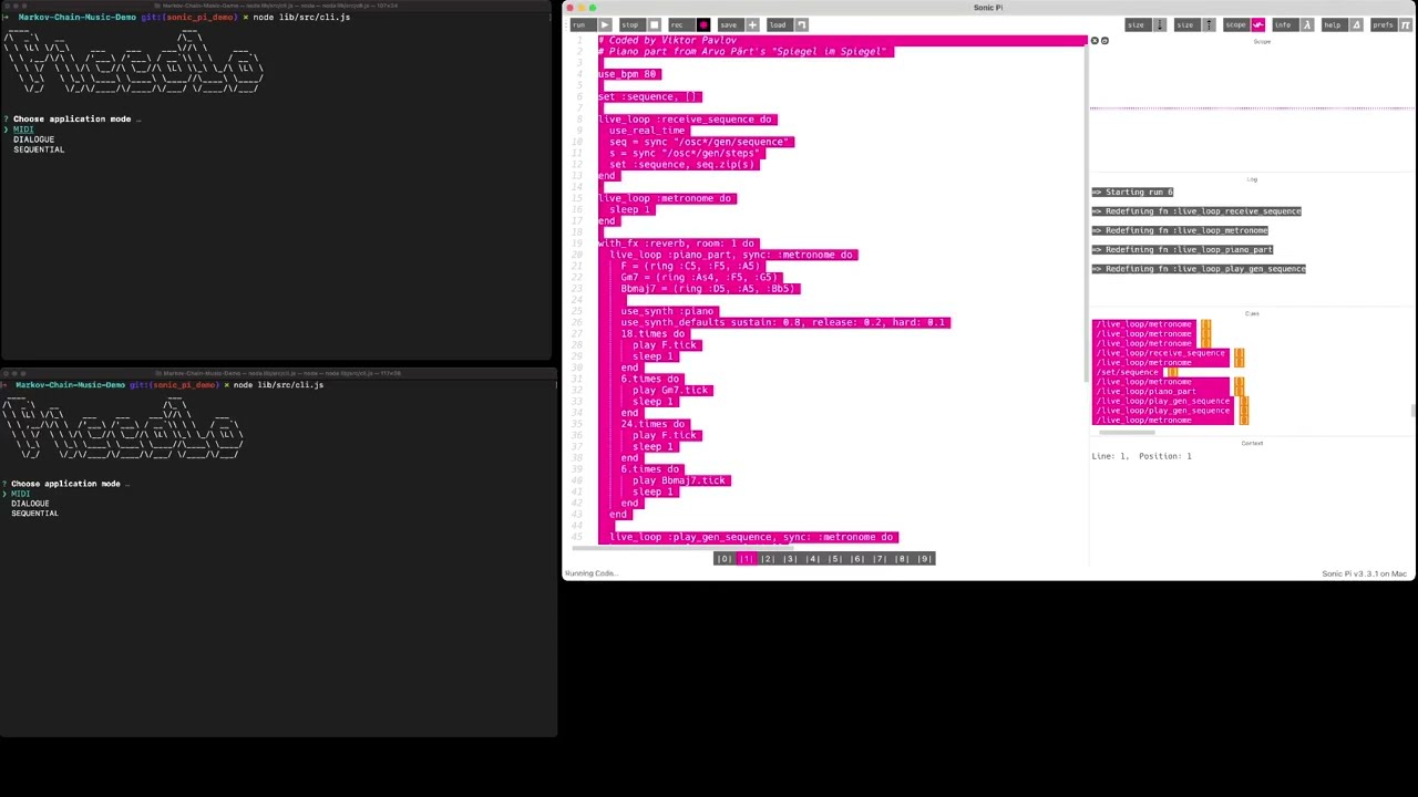 The application supports integration with Sonic Pi, utilizing the Open Sound Control protocol. Melody variations can be generated from MIDI sources and from messages sent by Sonic Pi directly in real-time. Two backends for algorithmic music generation are implemented: Markov chains and a wrapper around Magenta’s MusicRNN chord_pitches_improvcheckpoint.